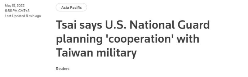 路透社刚刚消息,台湾民进党当局领导人蔡英文5月31日声称,美国正积极筹划美国国民警卫队和台湾军方之间进行“合作”。报道称,这是台当局“抱怨来自中国(大陆)日益增长威胁”之际,深化美台“安全关系”之举。不过,对于这种宣扬合作的炒作之举,不少岛内网友并不买账,有人讽刺说,这是在“开创商机”?美国“又来要钱了”?
