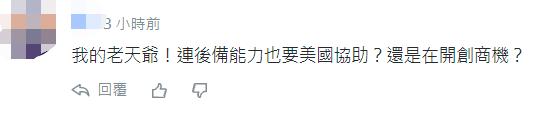 而对于蔡英文宣扬炒作的美台“合作”消息,有岛内网友讽刺,“我的老天爷!连后备能力也要美国协助?还是在开创商机?”↓