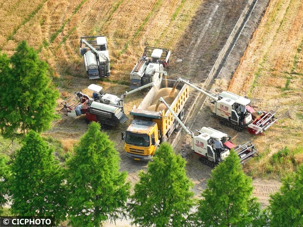 ↑2022年5月22日,在安徽省芜湖市繁昌区平铺镇山河村麦田边,农民驾驶农机将收割的小麦装车。(无人机照片)CICPHOTO/杨华 摄