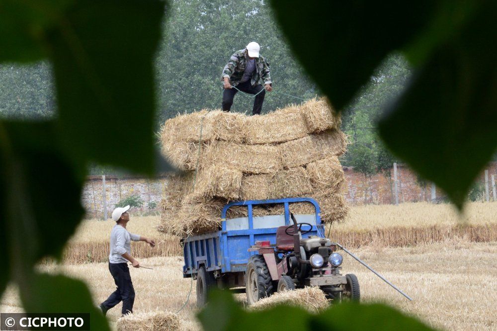 ↑2022年5月27日,在河南省驻马店市汝南县宿鸭湖街道白庙社区麦田里,农民将打捆好的小麦秸秆装车。CICPHOTO/孙凯 摄