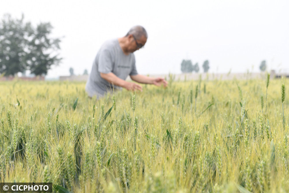 ↑2022年5月22日,河北省邢台市广宗县大平台乡南葛村农民在麦田里查看小麦长势。CICPHOTO/刘素志 摄