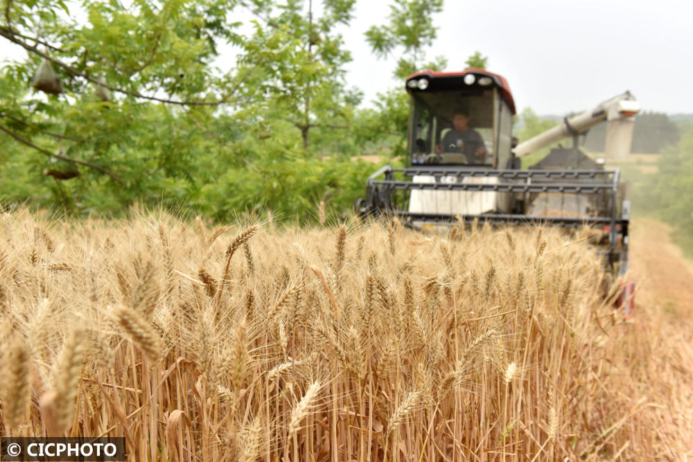 ↑2022年5月27日,安徽省巢湖市一家农业企业的工人驾驶收割机在薄壳山核桃林下收割套种的小麦。CICPHOTO/马丰成 摄