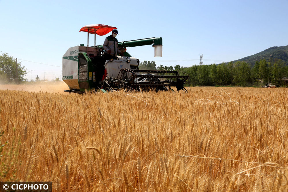 ↑2022年5月20日,在山东省枣庄市孟庄镇孟庄村麦田里,农机手驾驶收割机收割小麦。CICPHOTO/吉喆 摄