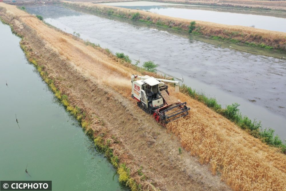 ↑2022年5月28日,在江苏省淮安市洪泽区东双沟镇张庄村特色种养殖基地,农机手驾驶收割机收割小麦。(无人机照片)CICPHOTO/刘彬 摄