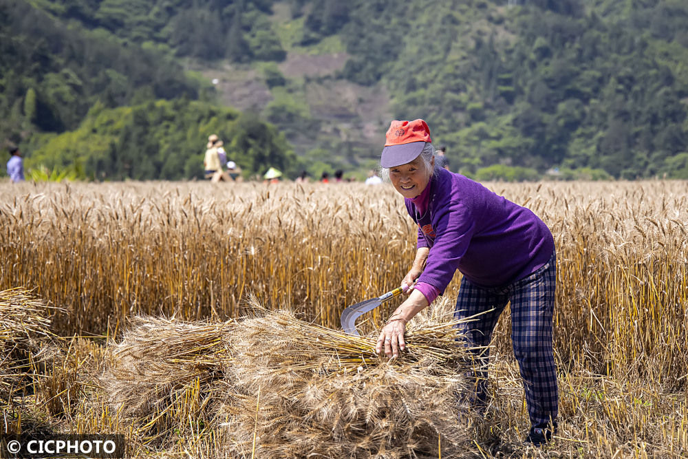 ↑2022年5月27日,农民在浙江省杭州市淳安县左口乡农业共富基地收割高山小麦。CICPHOTO/毛勇锋 摄