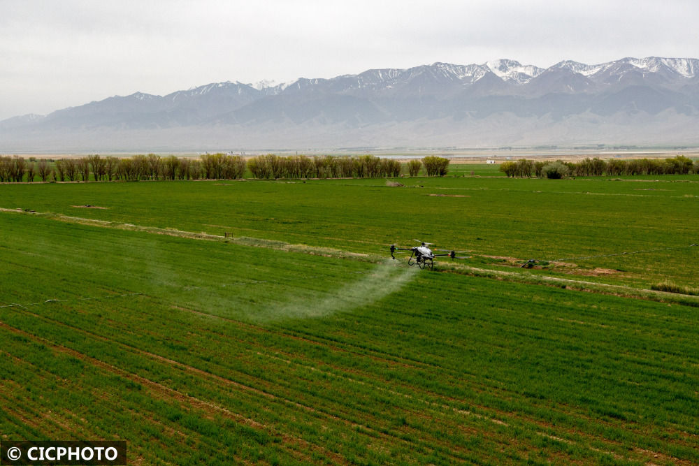 ↑2022年5月24日,在新疆哈密市巴里坤哈萨克自治县大河镇一处麦田,植保无人机在对小麦进行“一喷三防”作业。(无人机照片)CICPHOTO/普拉提 摄