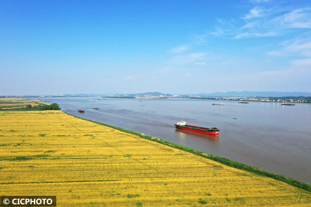 ↑2022年5月16日,在安徽省安庆市宿松县长江北岸的华阳河农场,麦浪飘香,风景如画。(无人机照片)CICPHOTO/李龙 摄