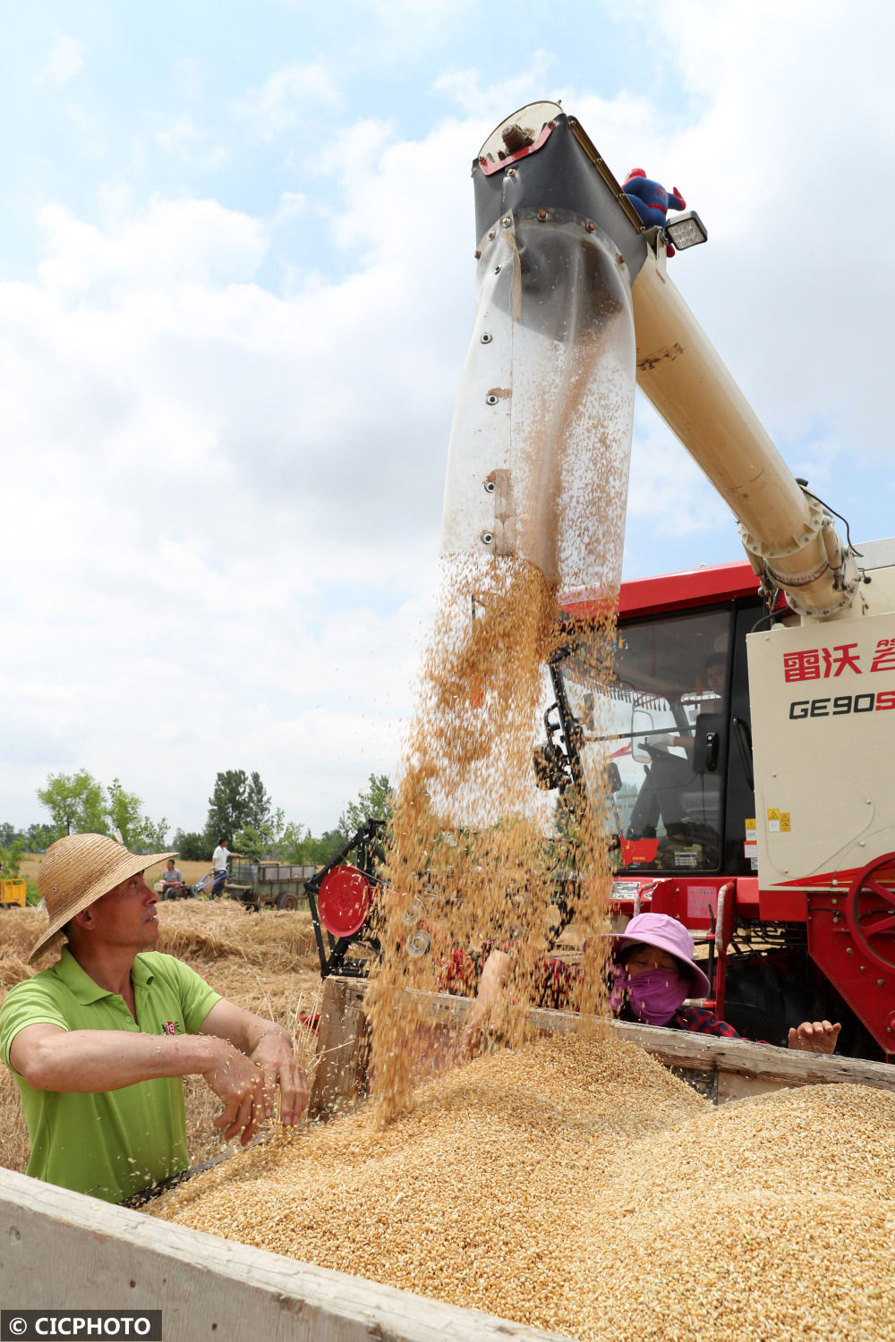 ↑2022年5月29日,在安徽省亳州市蒙城县立仓镇杨庄村,农民驾驶农机将收割的小麦装车。CICPHOTO/胡卫国 摄