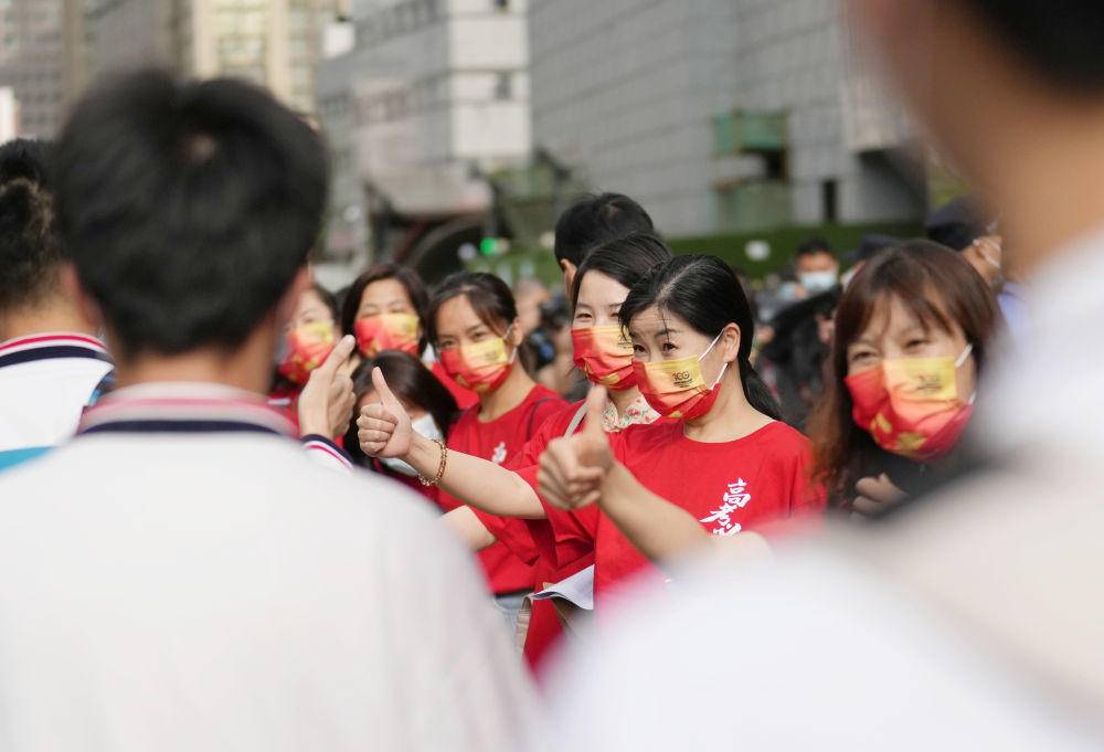 ↑6月7日,在北京市陈经纶中学考点外,送考老师为即将进入考点的考生加油鼓劲。新华社记者 鞠焕宗 摄