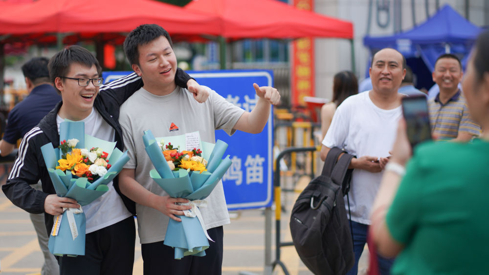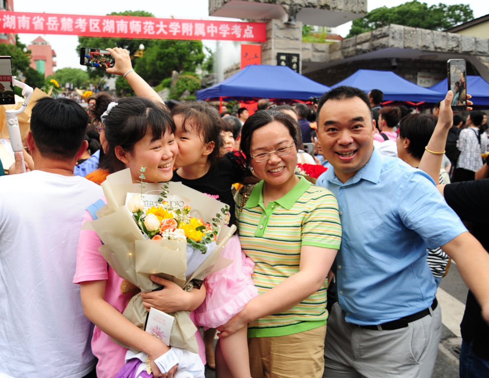 ↑6月9日,在湖南师范大学附属中学考点,考生结束考试后走出考场,手捧鲜花和家人合影留念。新华社记者 明星 摄