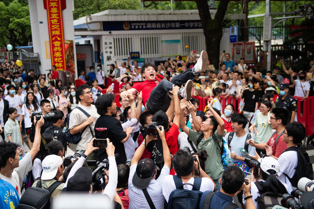 ↑6月9日,在湖南省长沙市一中考点外,学生抛起老师庆祝高考结束。新华社记者 陈思汗 摄