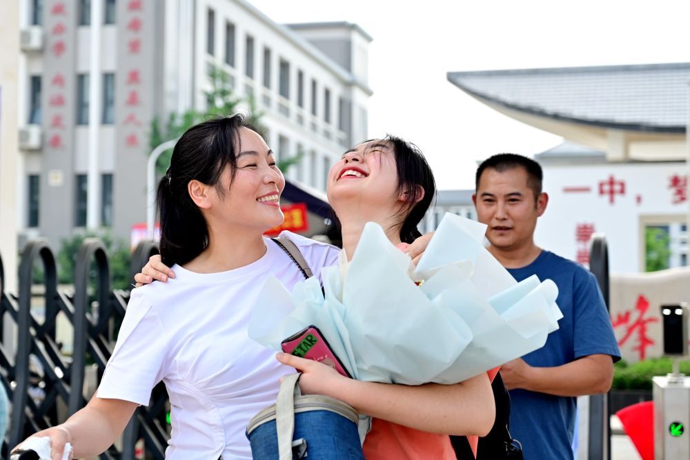 ↑6月9日,在湖南省双峰县第一中学考点,家长为结束高考的考生送上鲜花。新华社发(李建新 摄)