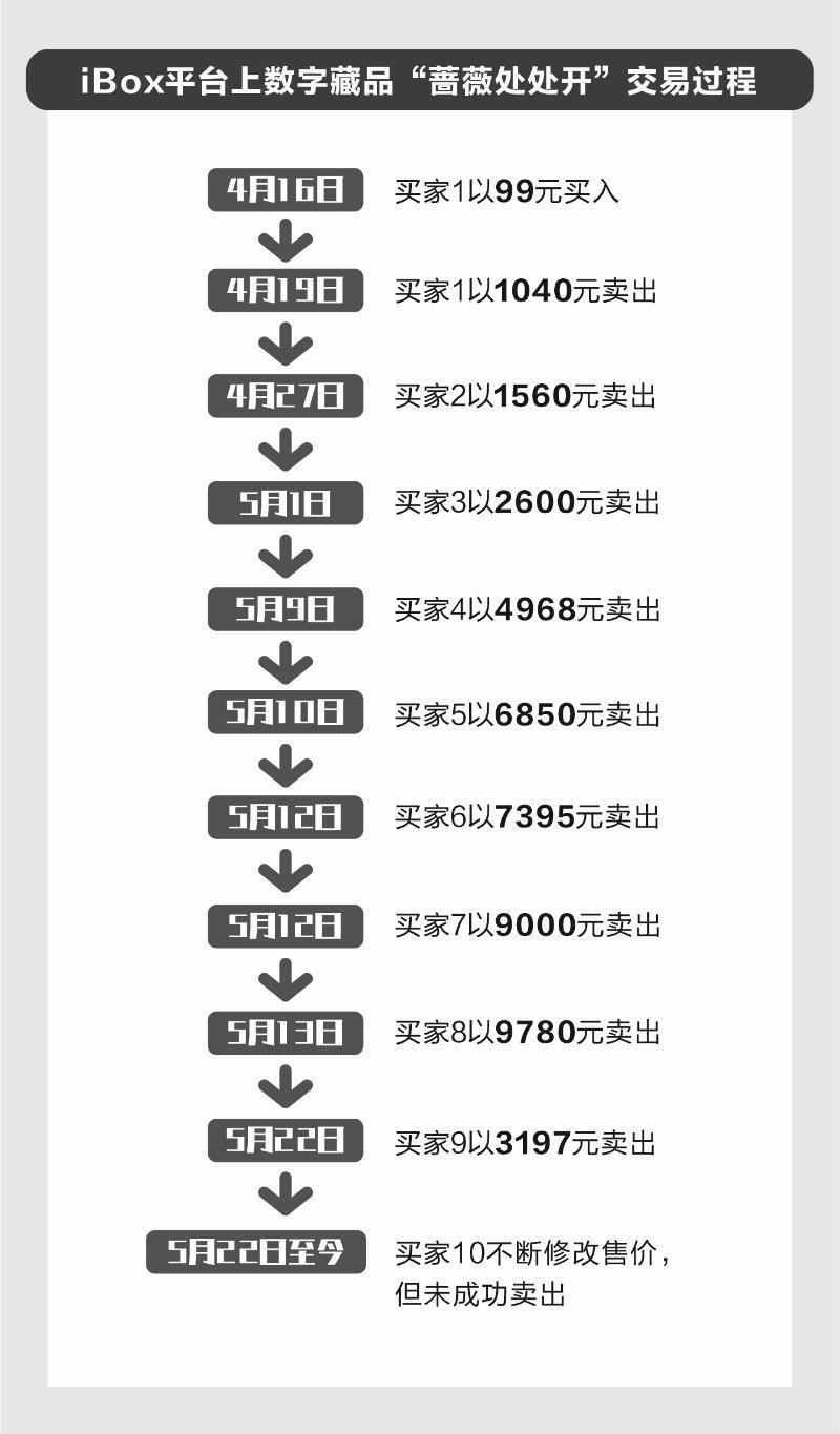该平台上一款名为“蔷薇处处开”的数字藏品的交易记录,生动地展现了数字藏品在定价、交易方面的混乱景象。