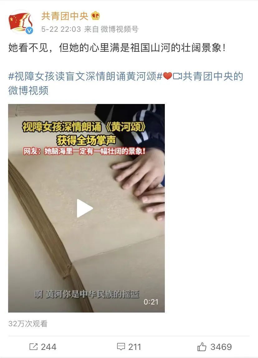 近日一位盲人女孩充满力量地朗诵《黄河颂》的视频令无数网友感动落泪。