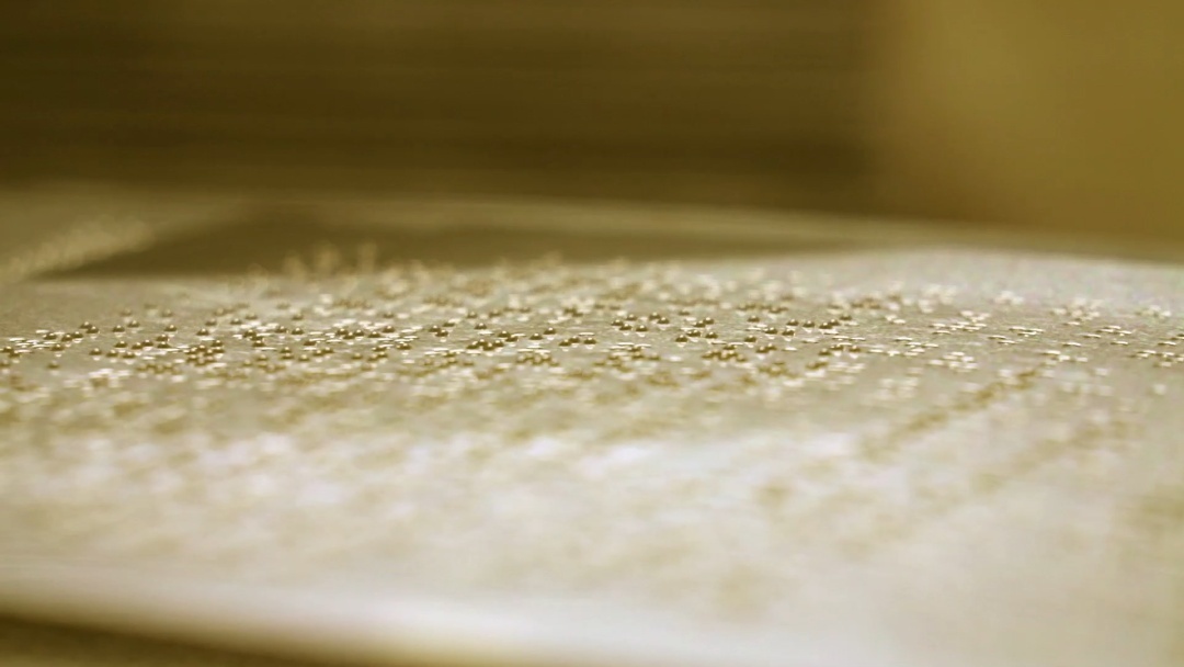盲人书籍中排列着密密麻麻的点阵,在盲人的触觉中,是一个一个的小方格,每个小方格里有一到六个小凸点,凸点的位置不同,则代表不同的拼音字母、声调和符号。
