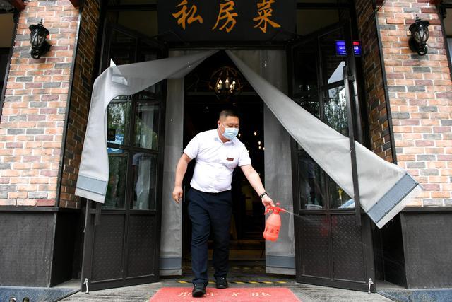 6月13日,呼和浩特市赛罕区一家餐厅的经营者在门前喷洒消毒液。新华社记者 贝赫 摄