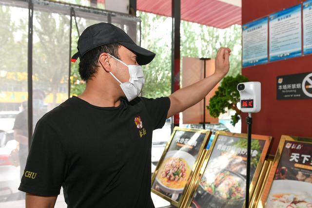 6月13日,在呼和浩特市赛罕区一家餐厅外,餐厅服务人员在开餐前测量体温。新华社记者 贝赫 摄