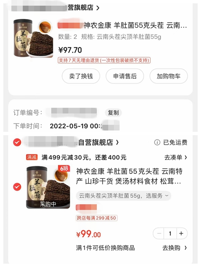 还有消费者给中新财经提供的订单记录显示,5月19日在某电商平台上购买的羊肚菌,显示每盒单价是97.7元,买了2盒,领了20元优惠券后,共消费175.4元。在6月16日同一商家同一产品显示单价是99元,还没有了20元优惠券,即便也可减去20元优惠,同样买2盒也需要消费178元。