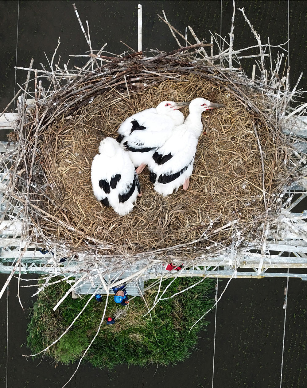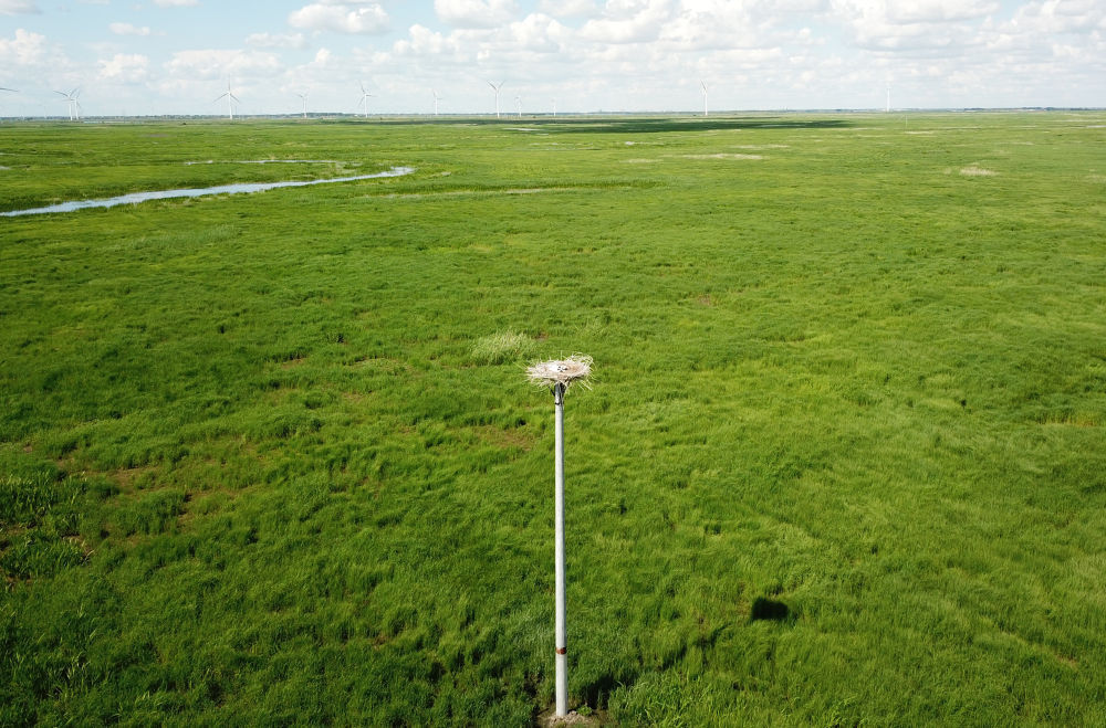 6月16日拍摄的国网齐齐哈尔供电公司在黑龙江乌裕尔河国家级自然保护区内修建的一个人工鸟巢,巢内有东方白鹳幼鸟。