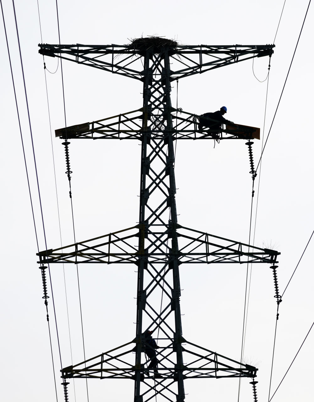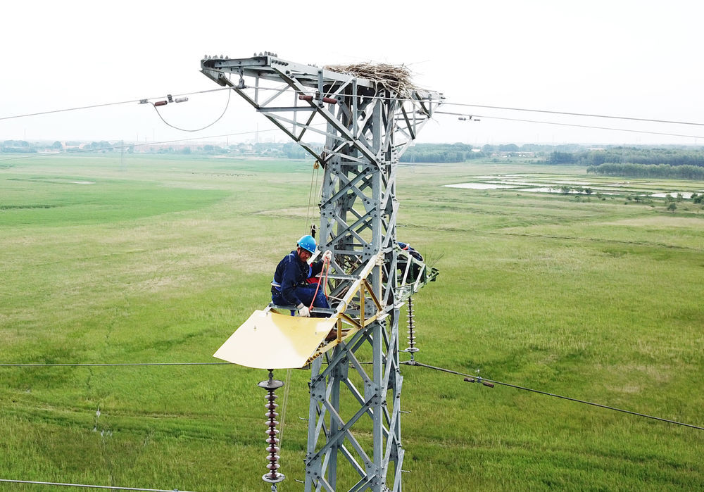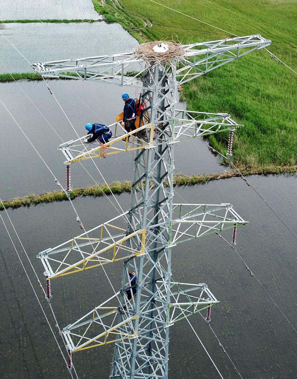 6月15日,电力工人在一输电铁塔上的东方白鹳鸟巢下安装护鸟板。