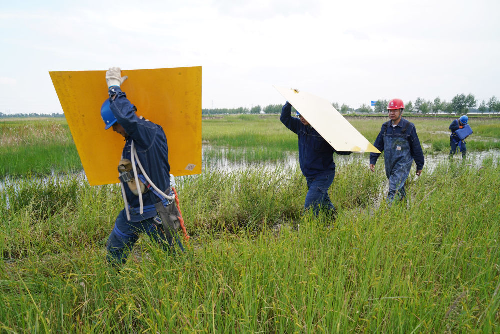 6月15日,电力工人携带装备行走在湿地上,准备给一输电铁塔安装护鸟板。