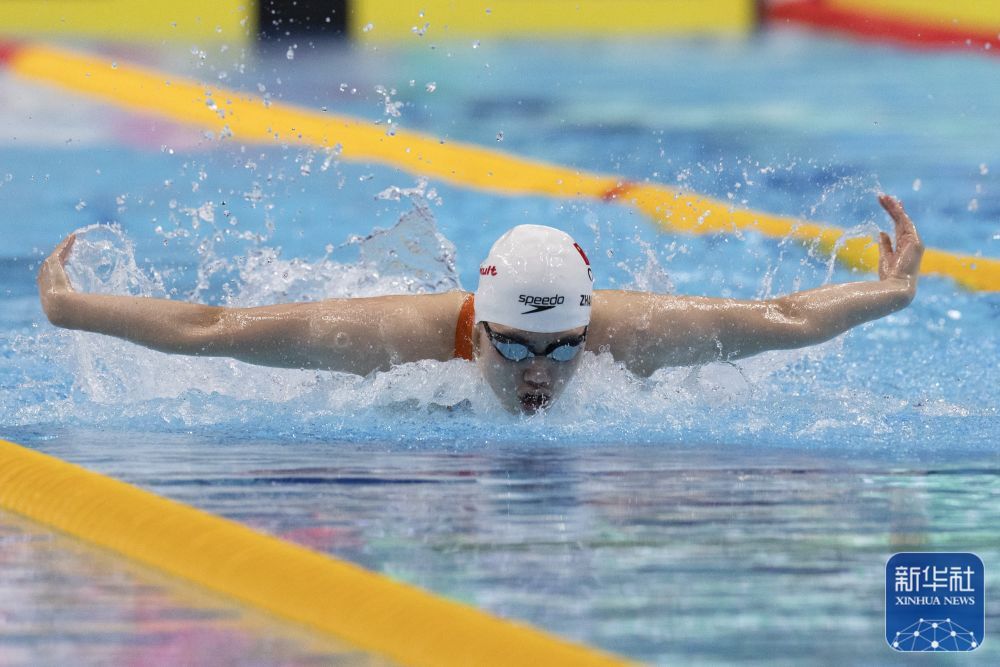 ↑中国选手张雨霏在女子100米蝶泳预赛中,她晋级该项目半决赛。