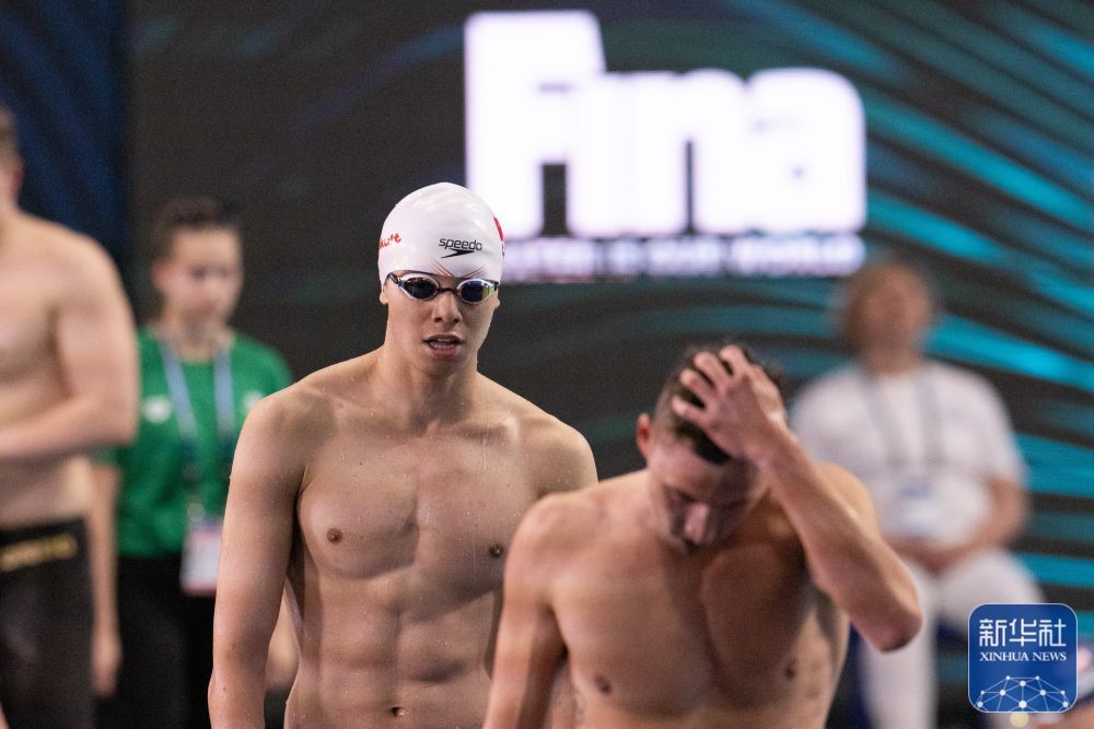 ↑中国选手季新杰(前左)在男子400米自由泳预赛后,他无缘该项目决赛。