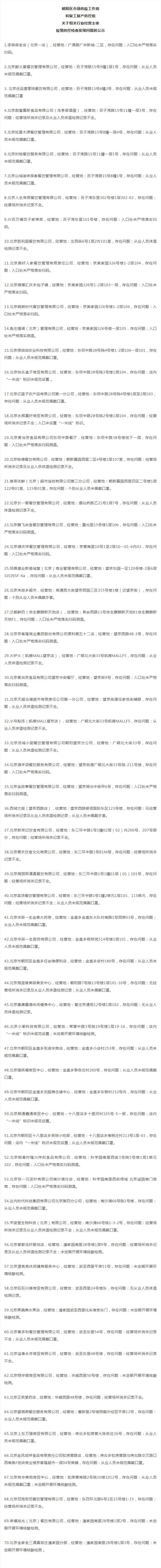 据“北京朝阳”微信公众号19日消息,北京朝阳区市场防疫工作组和复工复产防控组针对朝阳区相关行业经营主体疫情防控工作开展检查,检查中发现70家企业不能严格落实主体责任,未能全面执行各项疫情防控措施,其中包括北京麦当劳食品有限公司东坝中路餐厅、兰熊鲜奶(合生麒麟新天地店)、小吊梨汤(凯德MALL望京店)、北京汤城小厨餐饮管理有限公司朝阳望京分公司等。