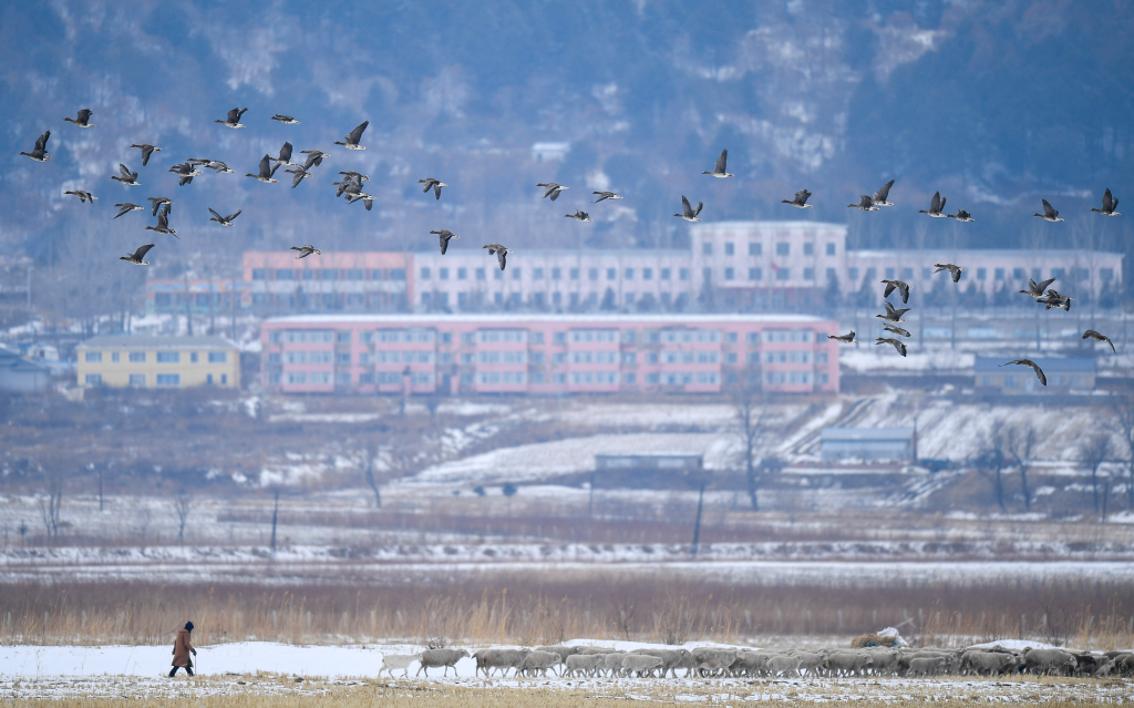 这是在吉林省珲春市敬信湿地附近拍摄的大雁。(新华社记者 许畅摄)