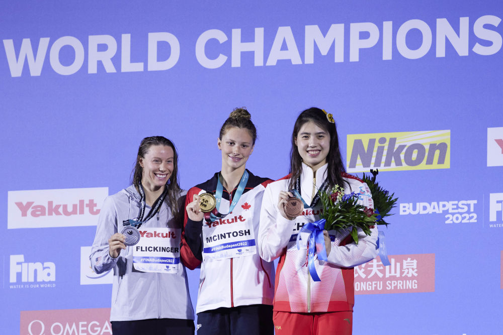 冠军加拿大选手麦金托什(中)、亚军美国选手弗利金格(左)和季军中国选手张雨霏在颁奖仪式上合影。新华社记者 孟鼎博 摄