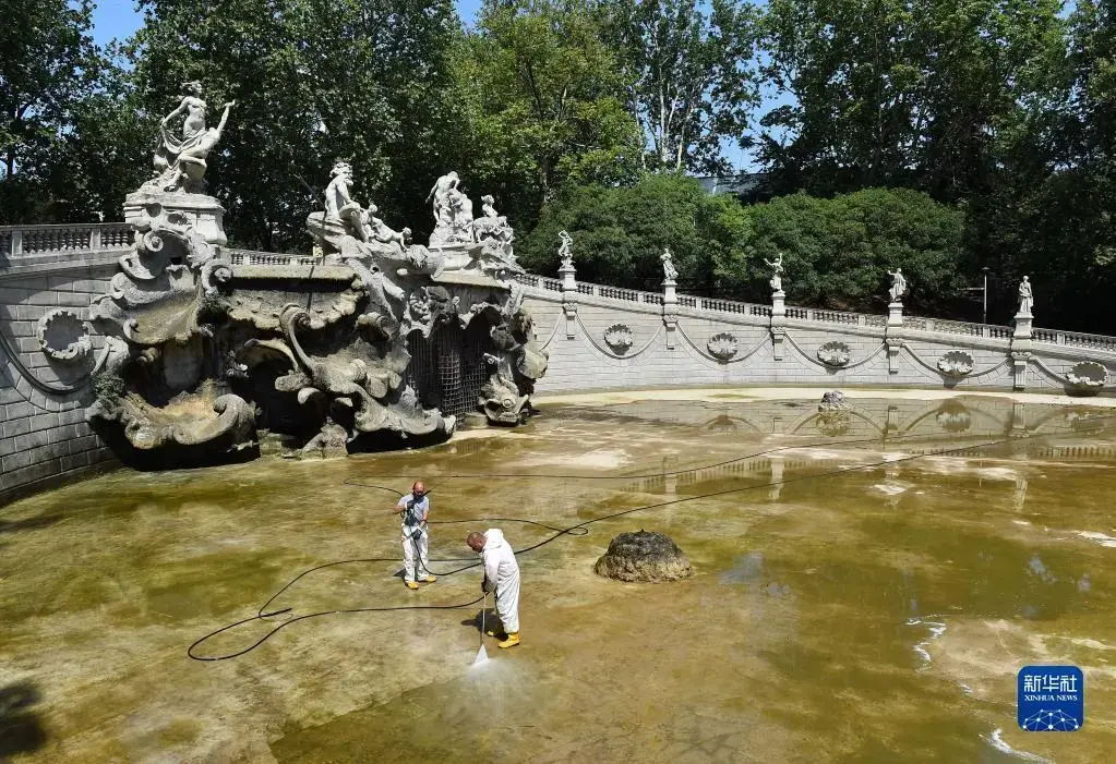 6月18日,工作人员在意大利都灵清理缺水的喷泉。