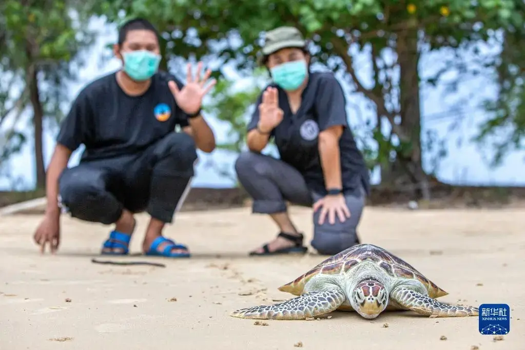 6月21日,在泰国罗勇府蒙奈岛海龟保护中心,南塔日卡博士(右)和同事将海龟放归自然。