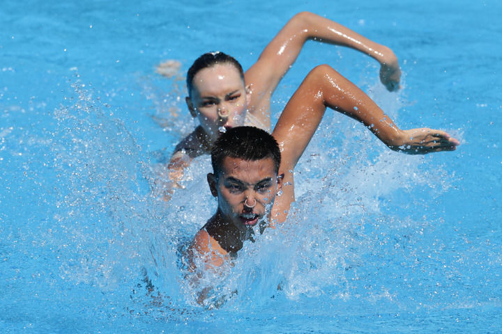 ↑6月25日,石浩玙(前)/张依瑶在花样游泳混双自由自选决赛中获得铜牌。