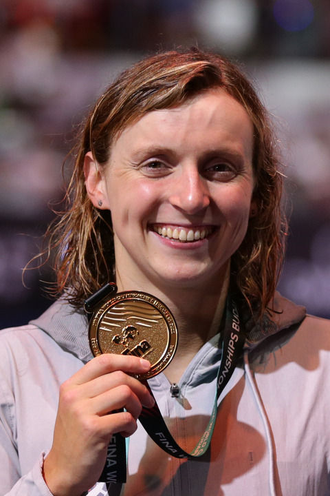 6月24日,莱德茨基在女子800米自由泳颁奖仪式后展示奖牌。美国名将莱德茨基在本届游泳世锦赛女子400米、800米、1500米自由泳,女子4x200米自由泳接力比赛中收获四枚金牌,可谓宝刀未老。
