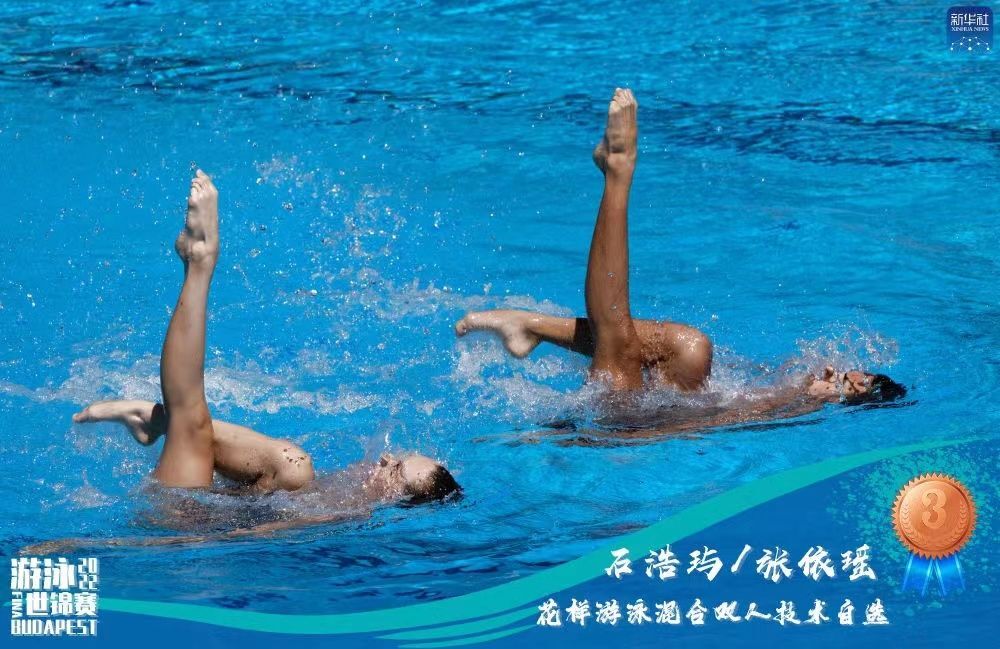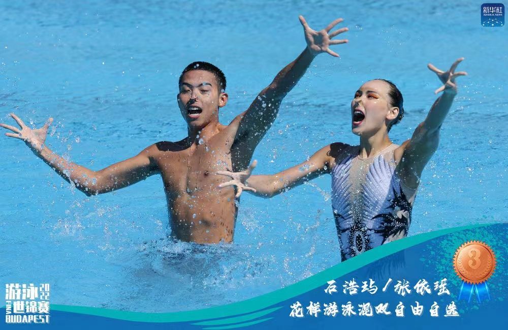 混双组合石浩玙、张依瑶20日在花样游泳混双技术自选项目中以86.4425分获得铜牌。这是中国花游选手在世锦赛混双项目上首次获得奖牌。25日,这对混双组合再次获得混双自由自选铜牌。
