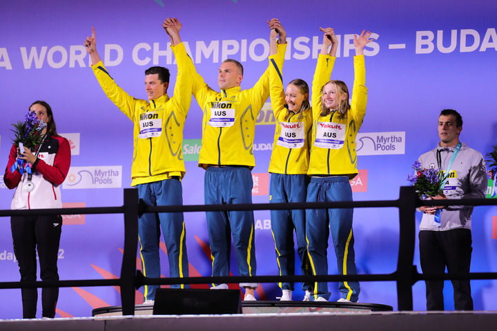 ↑6月24日,澳大利亚队选手在男女4x100米自由泳接力颁奖仪式上庆祝。由卡特赖特、查默斯、威尔逊和奥卡拉汉组成的澳大利亚队以3分19秒38的成绩打破世界纪录,并夺得冠军。