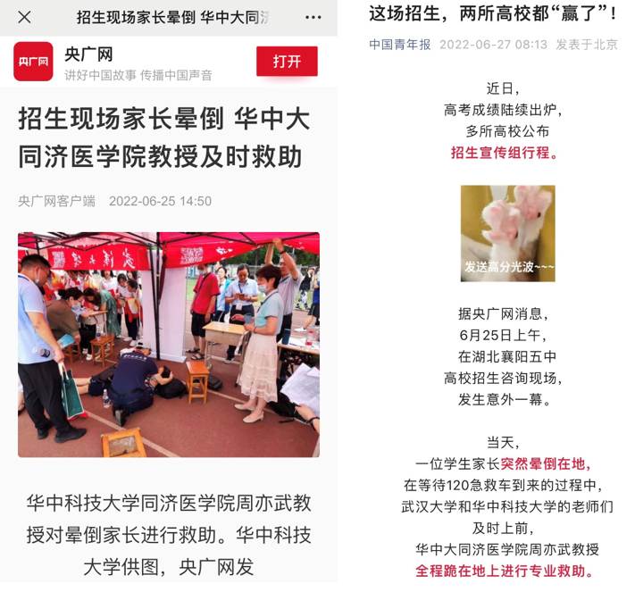 近日,一则报道刷屏了朋友圈。原来在高校招生咨询现场,一位学生家长突然晕倒在地,华中科技大学同济医学院周亦武教授及时上前,全程跪在地上进行专业救助,十几分钟后这名家长逐渐状态恢复,被央广网、人民网、新华社、中国青年报等多家媒体点赞报道。网民称赞为“最具实力和真诚”的招生宣传。