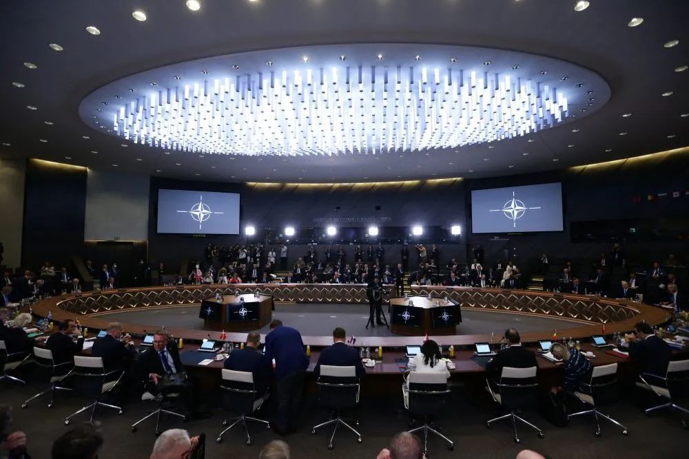 ↑6月16日,与会人员在比利时布鲁塞尔的北约总部出席北约成员国国防部长会议。新华社记者郑焕松摄