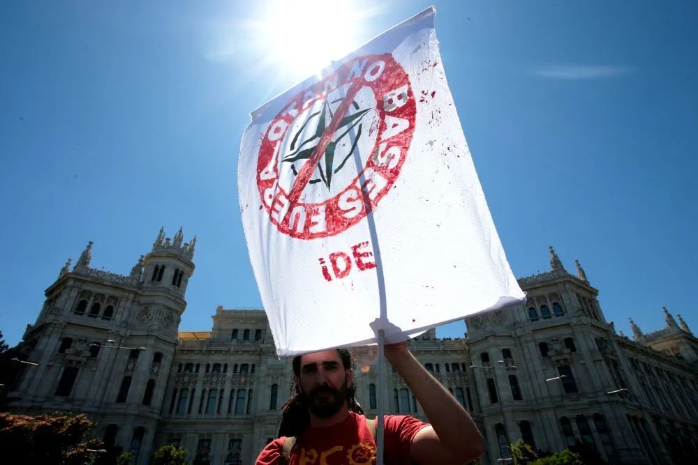 ↑6月26日,在西班牙首都马德里,数千人参加反对北约、呼吁世界和平大游行。(新华社发,胡安·卡洛斯·罗哈斯摄)