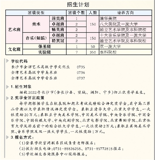 6月26日,长沙市金律艺术高级中学挂牌,这是经长沙市教育局批准的我省首个民办艺术高中。该校前身为长沙市岳麓区金律教育培训学校,创办17年以来,始终坚持名家办学、专家治校、德育智育双轮驱动、“文化+艺术”多措并举,打破了艺术生文化成绩是短板的魔咒,累积了教书育人八大特色优势,为我省艺术教育树立了标杆。