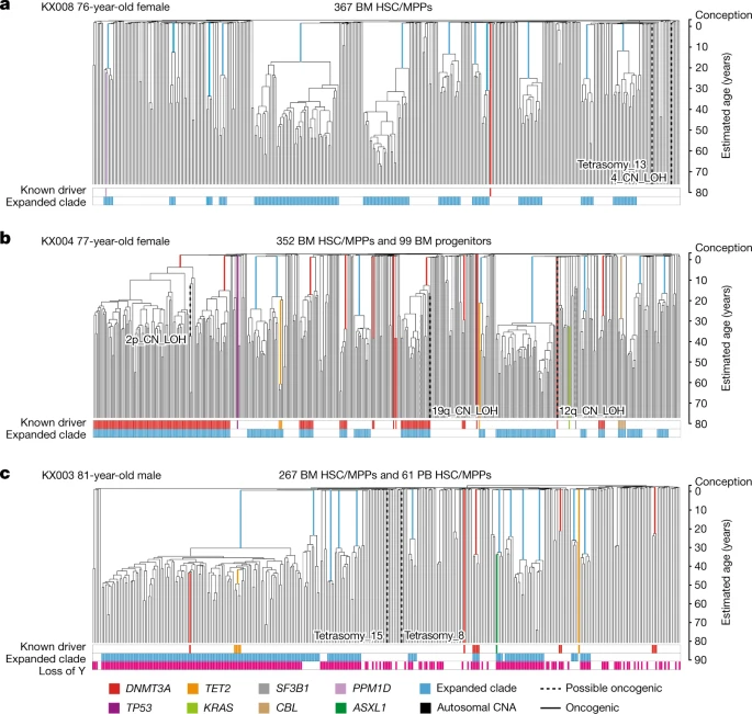 需要注意的是,这些干细胞不仅线性累积了大量突变,而且其数量会因一种名为“驱动突变”的体细胞突变子集逐渐扩大,直至完全“领导”人体骨髓。