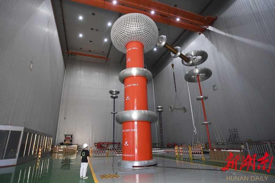 ↑6月14日,国网湖南电力防灾减灾中心,特高压试验大厅可进行特高压及以下输变电设备工频、雷电、过高压试验。