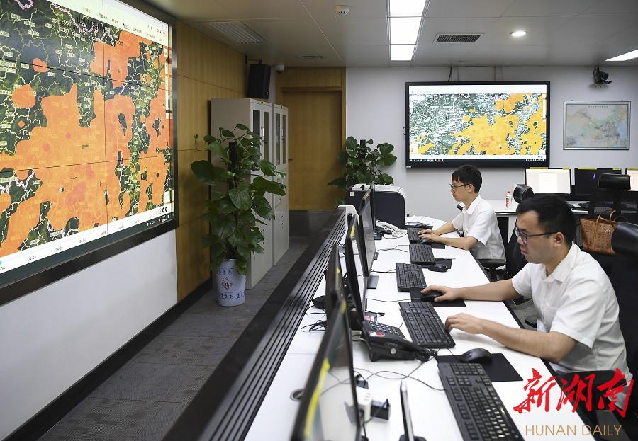 ↑6月14日,国网湖南电力防灾减灾中心,科研人员在监控灾害情况。