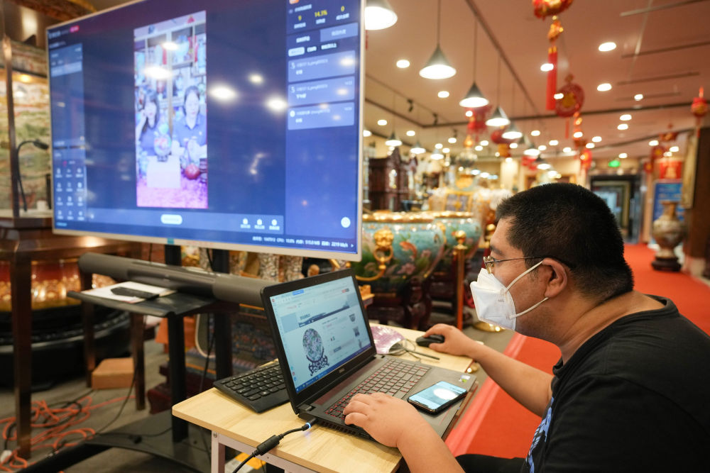 6月18日,在北京市珐琅厂有限责任公司,工作人员在网络直播间后台上架景泰蓝商品。(新华社记者鞠焕宗 摄)