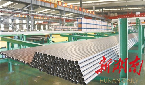 (湘投金天新材料有限公司高性能钛焊管生产车间摆放的管材。 李博斌 摄)