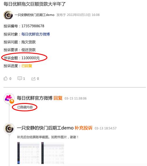 不仅如此,一位网友在黑猫投诉平台上反映“每日优鲜拖欠巨额货款大半年了”,投诉涉及的金额为110万元,该网友还附带了两张“后台结算账单截图”,并透露每日优鲜华南仓已基本停摆,90%的供应商已停货,每日优鲜还是毫无还款计划。