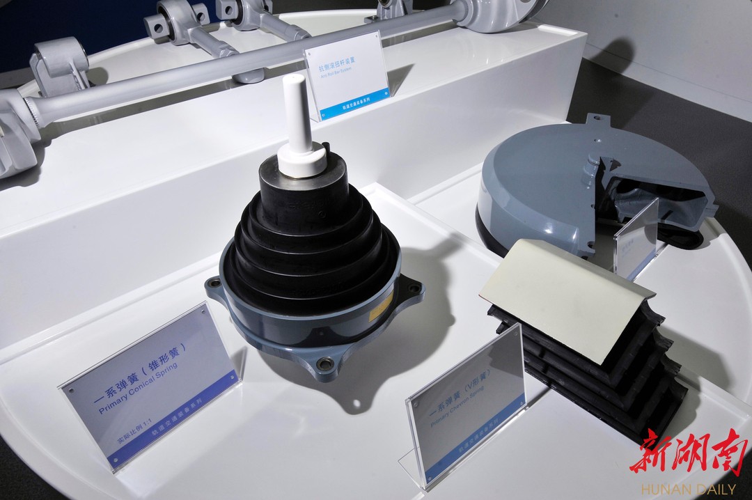 “新产品亮相,哪有那么简单!”在产品陈列室,时代新材轨道交通事业部工艺装备部副部长程志指着锥形橡胶弹簧说,仅这样一个安装在车轮和转向架之间的锥形减振装备,就“花费了大家七八年青春”。