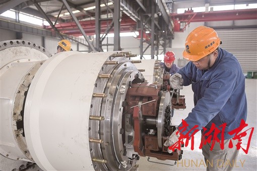 (5月13日,湘电集团湘电重型装备有限公司厂房,工作人员在调试120吨纯电自卸车的电动轮。湖南日报全媒体记者 傅聪 摄)