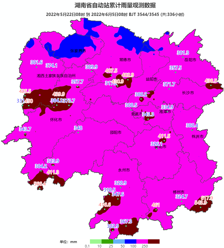 6月1日8时至5日8时,湘西土家族苗族自治州、怀化、常德南部、益阳、岳阳、长沙、邵阳北部、郴州南部出现暴雨大暴雨天气,全省平均面雨量69.7毫米,其中65个县(市、区)823站累计雨量超过100毫米,27个县(市、区)212站超过200毫米,花垣、汝城、辰溪、凤凰、泸溪、桃江、麻阳、鼎城区、永顺、吉首、汨罗11个县(市、区)41站超过300毫米,最大为花垣雅酉387.8毫米,其次为汝城集益386.4毫米。