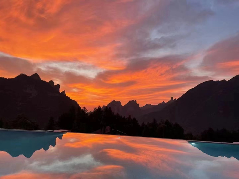 栖漫·悦林谷还有不容错过的崖谷无边泳池。民宿的泳池建于建筑与峡谷的中间,仿佛是长在山里一般。在这里朝起可看日出,晚归能赏夕阳。到了晚上,泳池周围的灯光亮起,音乐响起,又是一种别样的美。栖漫·悦林谷的无边泳池除了能赏风景,晒太阳,更是能在泳池边品精致的下午茶,或者尝到地道的土家美味。民宿还有户外餐厅,让你沉浸在如画美景中享受美味。户外餐厅的上方有一块草坪,白天可以带着小朋友玩耍,晚上可以扎帐篷露营,围着篝火与当地的居民跳一曲土家摆手舞。